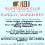 LOOKING TO MEET OTHER BOOK LOVERS? Adults 18 and over, join us every other Saturday morning at 10:30 am this spring for some coffee, tea, and quiet reading time. Bring your book or check out one here. Read for an hour or so and then socialize with the group, if you wish. Other Dates– Saturdays: March 7 […]