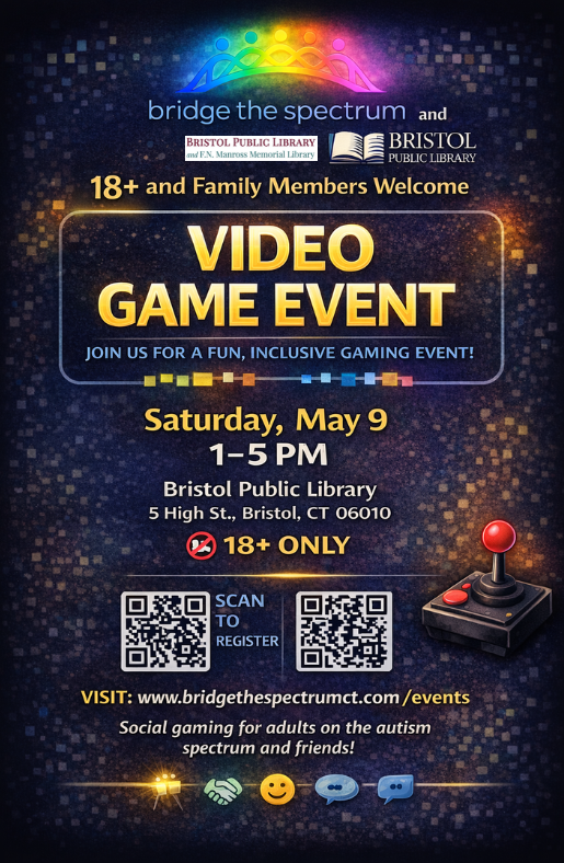 Join Bridge the Spectrum and Bristol Public Library for an inclusive 18+ Video Game Event for adults on the Autism spectrum. This event is designed to be relaxed, social, and welcoming for adults of all experience levels.