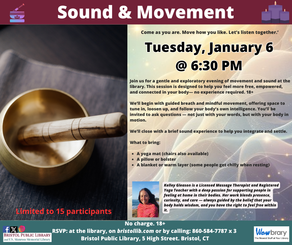 Join us for a gentle and exploratory evening of movement and sound at the library. This session is designed to help you feel more free, empowered, and connected in your body — no experience required.